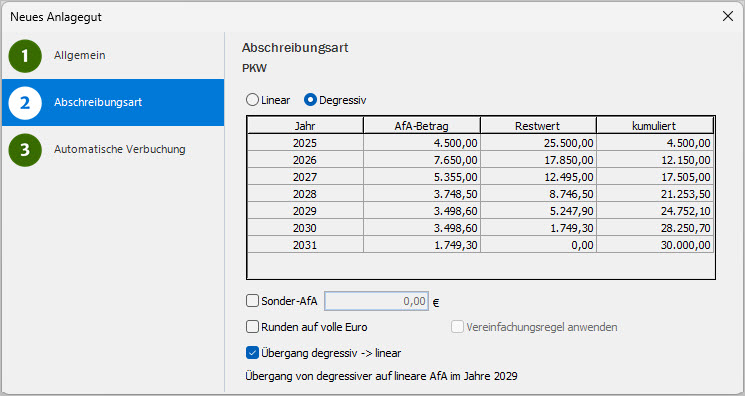 - Berechnung der degressiven AfA bei Anschaffungsdatum zwischen 01.07.2025 und 31.12.2027.