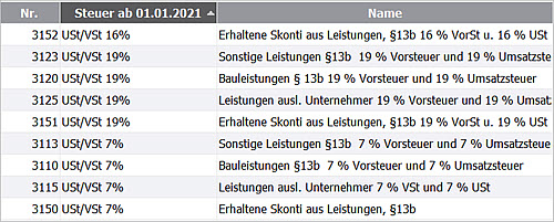Wichtig: Verwenden Sie die Konten, die in den Standardkontenrahmen für die Steuerfälle § 13b vorgesehen sind. Sie ermitteln diese Konten, indem Sie im Kontenplan über die Listeneinstellungen die Spalte 'Steuersatz ab 01.01.2021' einblenden und nach dieser Spalte sortieren.