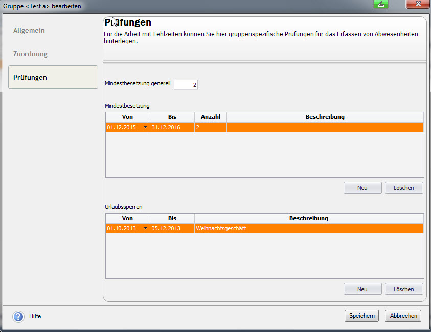 Wird in einem hinterlegten Zeitraum eine Abwesenheit für ein Gruppenmitglied im Buchungsmodul eingegeben, erscheint eine Nachricht, dass eine Urlaubssperre vorliegt oder ggf. die Mindestbesetzung unterschritten wird.