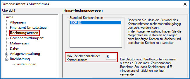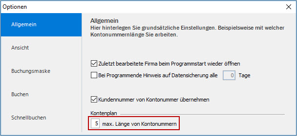 Die maximale Kontonummernlänge wird vom Programm automatisch passend zum gewählten Kontenrahmen eingestellt.