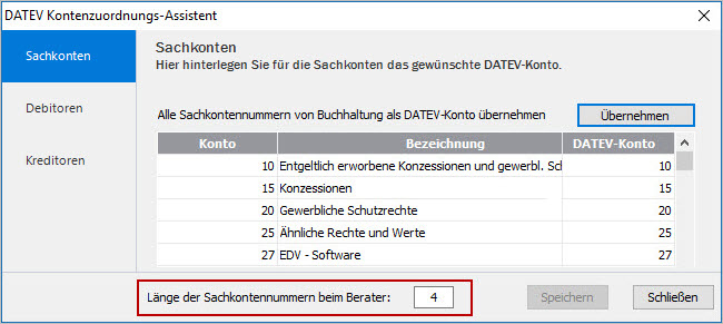 - Falls Sie die DATEV-Kontenzuordnung im Menü 'Verwaltung' nutzen, dann ändern Sie auch in diesem Assistenten die Länge der Sachkontennummern.