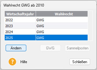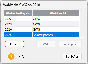 Die Abschreibungsarten 'GWG' und 'Sammelposten' schließen sich aufgrund des Wahlrechts gegenseitig aus.