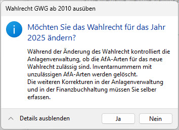 Deshalb prüft Lexware anlagenverwaltung bei Änderung des Wahlrechts für alle Inventarnummern, ob die Abschreibungsart für das neue Wahlrecht zulässig ist.