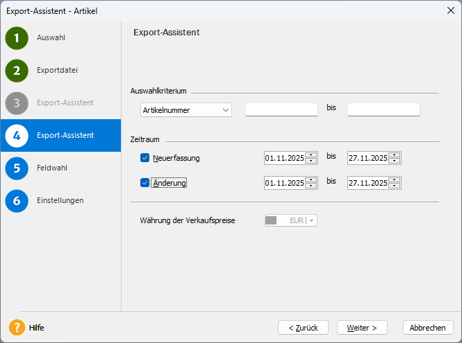- Grenzen Sie per Eingabe von Artikelnummern ein oder exportieren Sie nur geänderte oder neue Artikel.