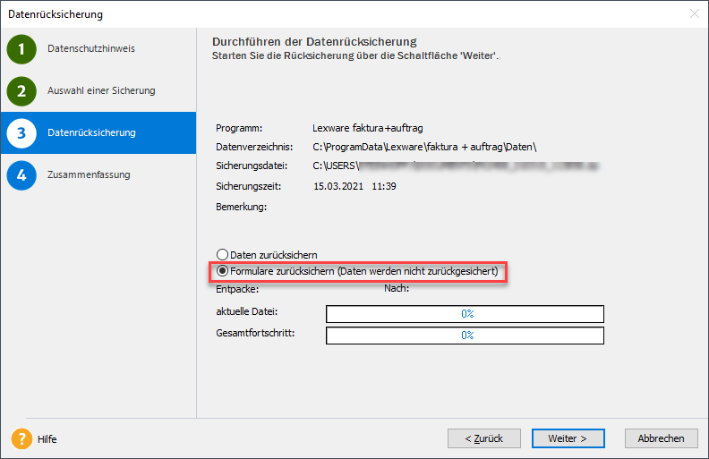 3. Wählen Sie die Option 'Formulare zurücksichern' und klicken Sie 'Weiter'
