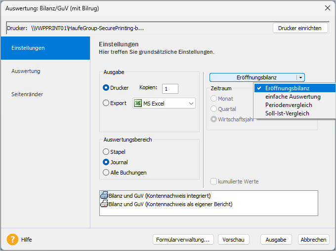 Hinweis: Wenn Sie bei einem Rumpfwirtschaftsjahr ein anderes Datum benötigen, exportieren Sie die Bilanz nach Word oder Excel. Passen Sie in Word oder Excel das Datum für die Eröffnungsbilanz an. - Wählen Sie den 'Auswertungsbereich'. Wenn die Buchungen noch im Stapel sind, wählen Sie 'Stapel' oder 'Alle Buchungen'. Der Bericht hat den Vermerk 'vorläufig'.
