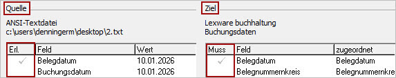 - Im Bereich 'Quelle' sehen Sie die Felder Ihrer Importdatei. Zugeordnete Felder sind in der Spalte 'Erl.' angehakt.