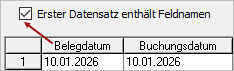 - Wenn der erste Datensatz den Feldnamen enthält, setzen Sie den Haken. Feldnamen sind die Bezeichnungen der Datenfelder, z. B. 'Kontonummer' oder 'Kontenbezeichnung'.