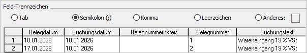 - Wählen Sie das 'Feld-Trennzeichen'. Dieses Zeichen trennt Ihre Datenfelder. Sie sehen die Auswirkung der gewählten Einstellung in der Datenvorschau unterhalb der Einstellungen.