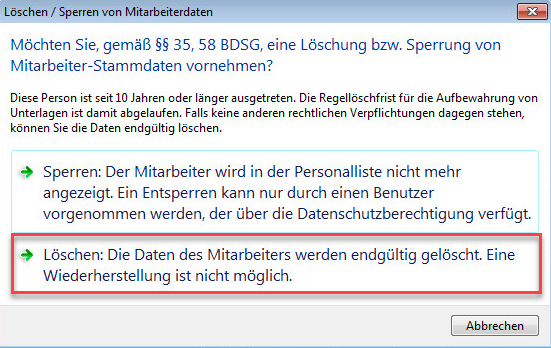 Wenn die Mitarbeiterdaten aufgrund der Aufbewahrungspflicht nicht gelöscht werden können, müssen Sie auf Verlangen des Mitarbeiters die Daten für die weitere Verwendung sperren.