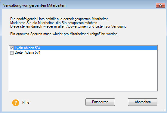 Durch die Sperr-Funktion kann der gesperrte Mitarbeiter in keiner Personalliste mehr ausgewählt werden.