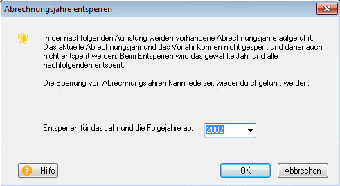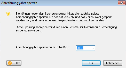 Über diese Funktion können Sie ganze Abrechnungsjahre sperren, das erspart Ihnen die aufwändige Auswahl von Einzeldaten.