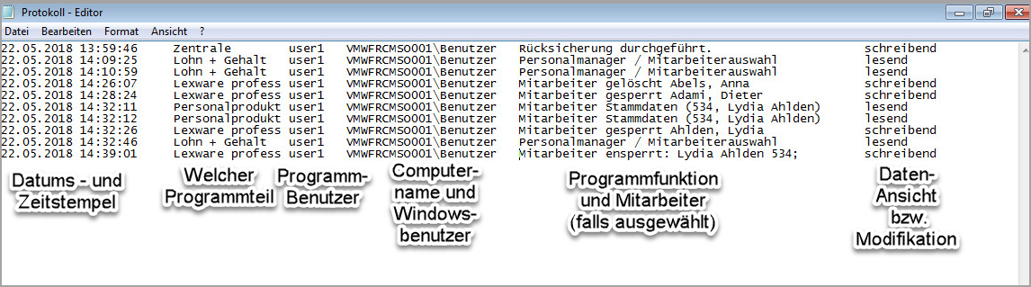 Lexware lohn+gehalt erstellt Ihnen eine 'csv-Datei' mit den oben genannten Inhalten. In dieser werden die Aktionen, der aktuell ausgewählten Firma, innerhalb der letzten 28 Tage ausgeben.