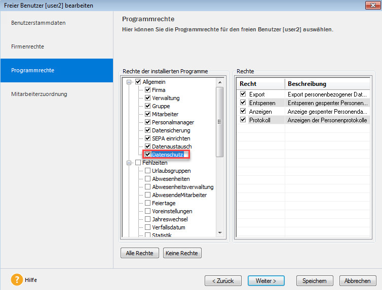 Zum Schutz der personenbezogenen Daten können Sie über das Programmrecht 'Datenschutz' festlegen, welcher Anwender welche Daten einsehen darf und welche Aktionen durchgeführt werden dürfen.