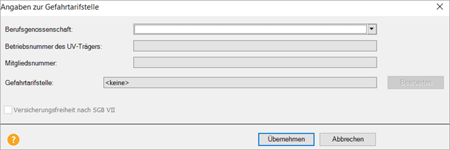 - Wählen Sie im nachfolgenden Fenster die aktuelle Berufsgenossenschaft (mit der neuen Unternehmensnummer) und Gefahrtarifstelle aus.