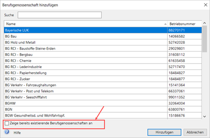 - Aktivieren Sie das Kontrollkästchen 'Zeige bereits existierende Berufsgenossenschaften an'.