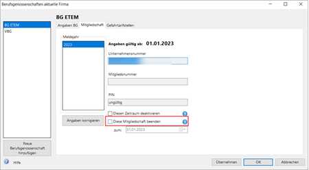 - Rufen Sie (ggf. über den Korrekturmodus den Abrechnungsmonat auf), ab dem die BG mit der neuen Unternehmensnummer gültig ist.