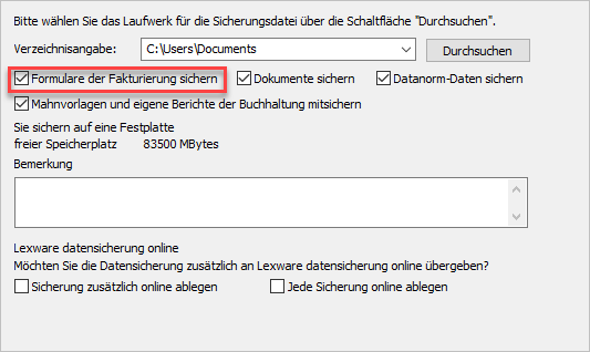 - Setzen Sie den Haken bei 'Formulare der Fakturierung mitsichern.