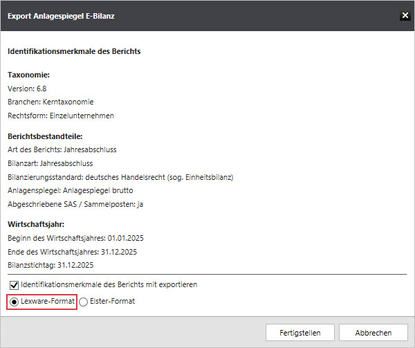- Im Dialog 'Export Anlagespiegel E-Bilanz' sehen Sie die Merkmale des Exportes.