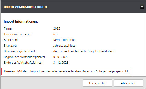 | Importdatei enthält keinen Anlagespiegel brutto. | Die von Ihnen ausgewählte Importdatei enthält keinen Anlagespiegel brutto. |
