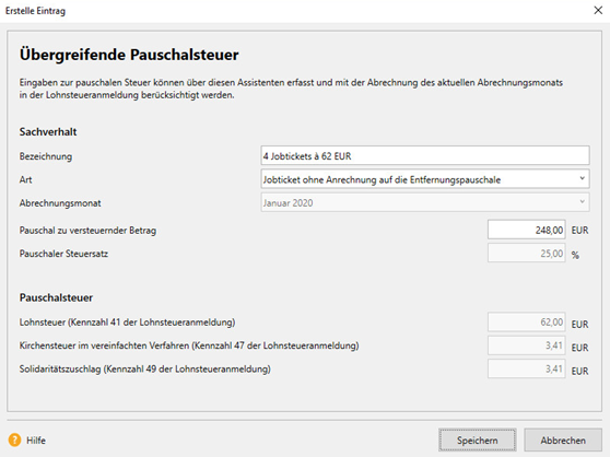 Im Assistenten 'Übergreifende Pauschalsteuer' können Sie Jobtickets, die in einem Pool liegen und keinem Mitarbeiter direkt zugeordnet werden können, abrechnen.