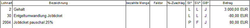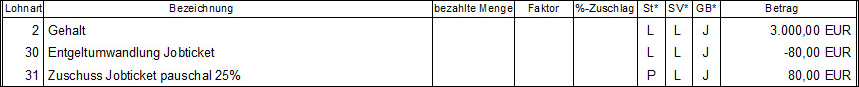 Beispiel: Ein Arbeitnehmer erhält im Rahmen einer Entgeltumwandlung einen Zuschuss für ein Jobticket in Höhe von 80,00 €.