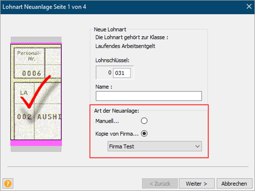 - Wählen Sie als Art der 'Neuanlage 'Kopie von Firma'.