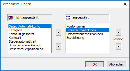 - Verschieben Sie die Einträge 'Steuerautomatik neu' und 'Umsatzsteuerposition neu' in den Bereich 'ausgewählt'.