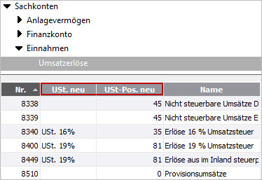 Im Kontenplan werden der Steuersatz und die Umsatzsteuerposition angezeigt.