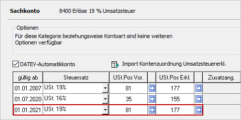 Im Kontenassistenten ist beim Konto 8400 Erlöse 19 % USt. (SKR-03) in den Steuerzeiträumen mit USt. 19 % die Umsatzsteuerposition (Kennzahl) 81 hinterlegt: