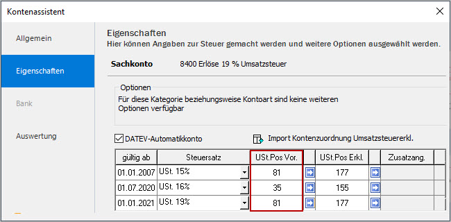 Die Umsatzsteuerposition (USt.Pos.Vor.) ist in den Steuereigenschaften der Konten oder in der Zusatzangabe der Buchung hinterlegt.