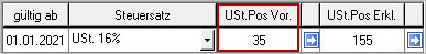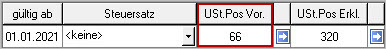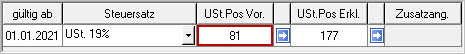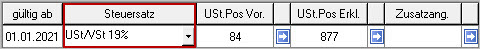 Hier finden Sie die Steuereigenschaften: Steuersatz, USt.Pos. und ggf. die Zusatzangabe.