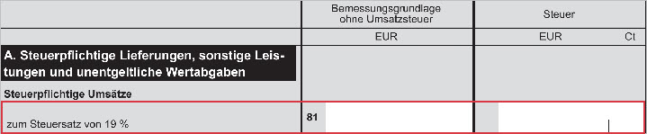 Steuerpflichtige Umsätze zum Steuersatz 19 % werden in der Umsatzsteuer-Voranmeldung in der Kennzahl 81 ausgewiesen.