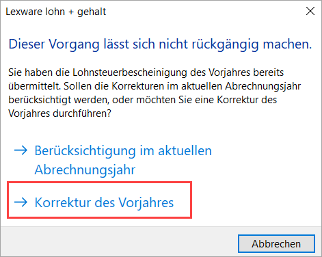 Wenn Sie den Eintrag 'Ja, wurde übermittelt' wählen, müssen Sie im nachfolgenden Fenster den Eintrag 'Korrektur des Vorjahres' auswählen. Ansonsten ist die Seite 'Steuerdaten' ausgegraut und es sind keine Korrekturen im Vorjahr mehr möglich.