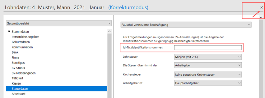 - Öffnen Sie die Seite 'Steuerdaten' in den Stammdaten des Mitarbeiters und entfernen bzw. korrigieren Sie die Steuer-ID und schließen Sie die Ansicht über das 'x'.