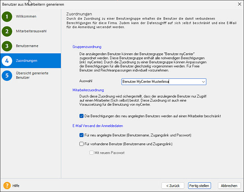 Auf Seite '3 - myCenter Benutzer' erstellen Sie für Ihre Mitarbeiter die Zugangsdaten, mit denen sie sich an Lexware myCenter anmelden können.