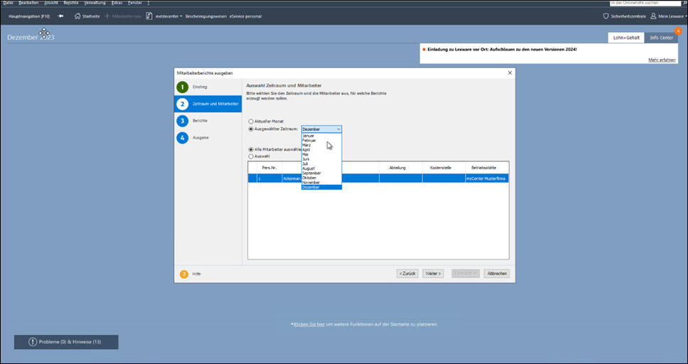 Auf der Seite zwei legen Sie fest, für welchen Auswertungszeitraum und für welche Mitarbeiter Sie Dokumente bereitstellen wollen.