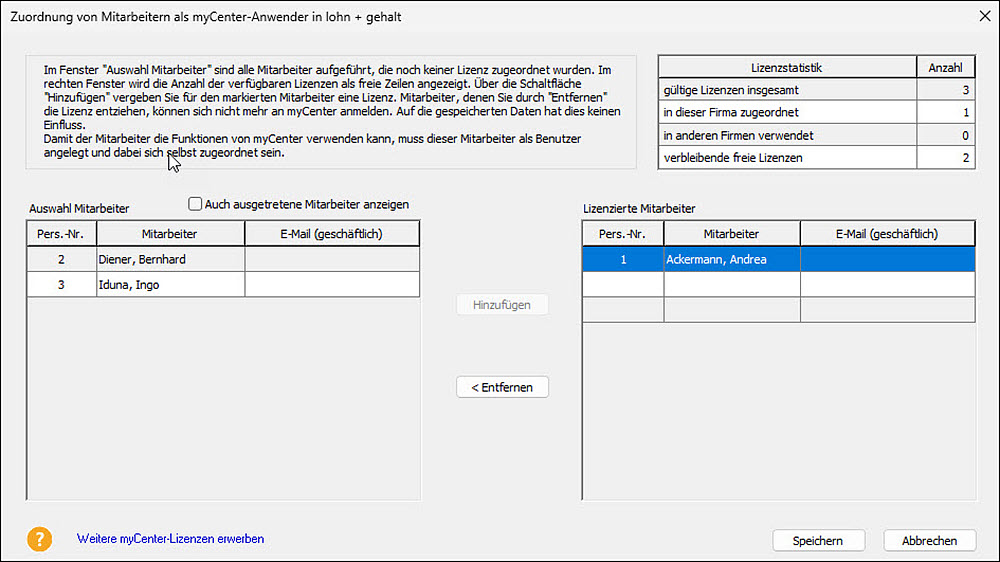 Umgekehrt können Sie bei Austritt eines Mitarbeiters die Lizenz auch wieder entziehen, indem Sie den Mitarbeiter markieren und auf 'Entfernen' klicken.