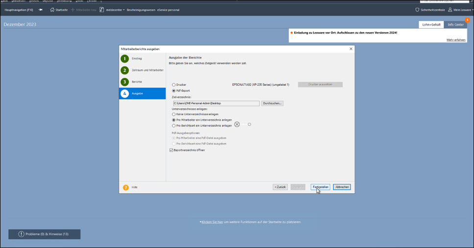 Mit Klick auf 'Fertigstellen' werden die Lohn-Dokumente an die Dokumentendatenbank für Lexware myCenter übergeben und stehen dort zur Abholung durch die Mitarbeiter bereit.