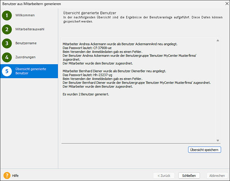 Auf der Seite Übersicht bekommen Sie einen Überblick über die generierten Benutzerdaten. Wenn die Mitarbeíter in Ihren Stammdaten von Ihnen eine geschäftliche Mail-Adresse eingetragen bekommen haben,