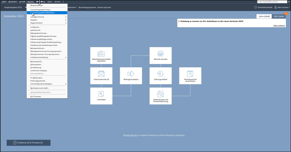 Öffnen Sie dazu über Menü 'Berichte - Auswertungspaket Mitarbeiter' den Assistenten für die Ausgabe der Mitarbeiterberichte.