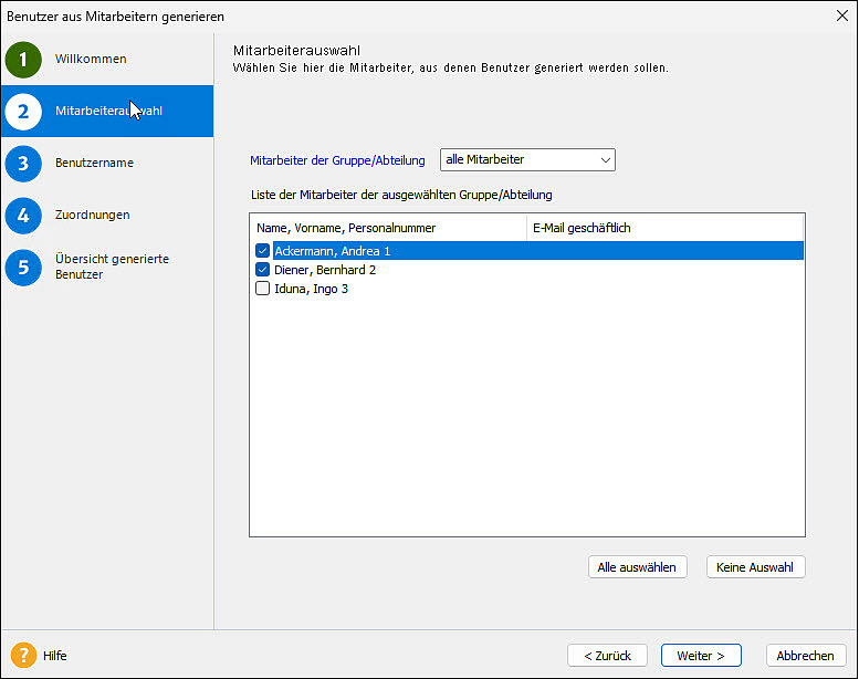 Es startet der Assistent für die Benutzeranlage. Auf der Seite 'Mitarbeiterauswahl' legen Sie fest, für wen die Zugangsdaten erstellt werden sollen. Standardmäßig werden alle Mitarbeiter durch die angehakte Checkbox vorgeschlagen, für die noch kein Benutzer angelegt wurde.