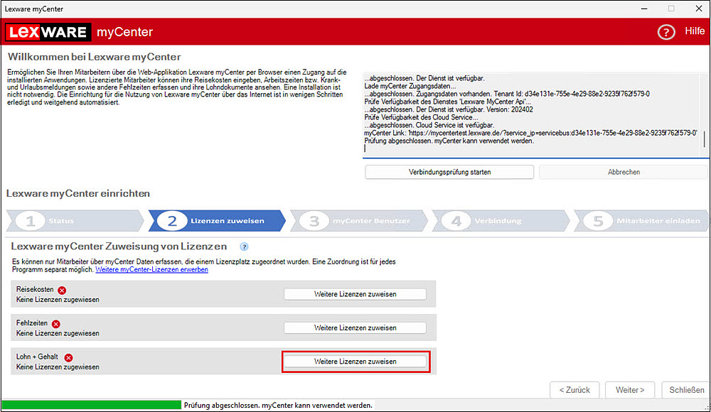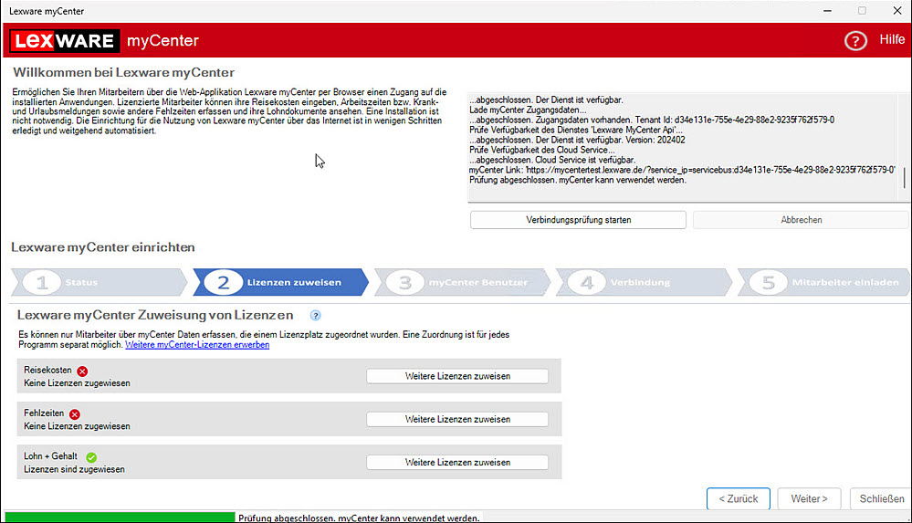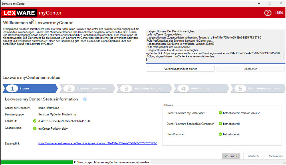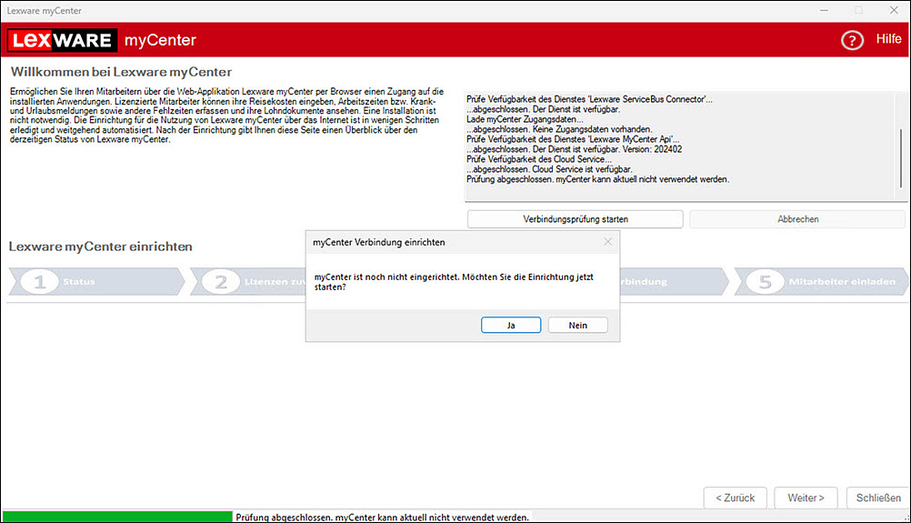 Mit dem ersten Aufruf des Einrichtungsassistenten startet die Einrichtung der Lexware myCenter-Verbindung.