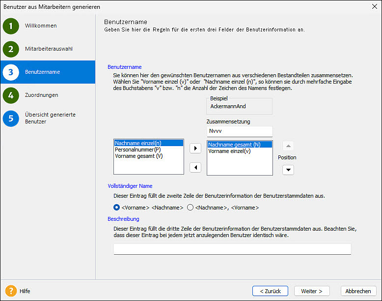 Auf der Seite 'Benutzername' legen Sie fest, wie die Benutzernamen der Mitarbeiter aufgebaut sein sollen. Das Programm empfiehlt standardmäßig den vollen Nachnamen, sowie die ersten drei Buchstaben des Vornamen. Sie können den Aufbau der Benutzernamen selbst anpassen. Es sind als Platzhalter auch Zeichen, wie Punkt, Bindestrich und Unterstrich möglich.