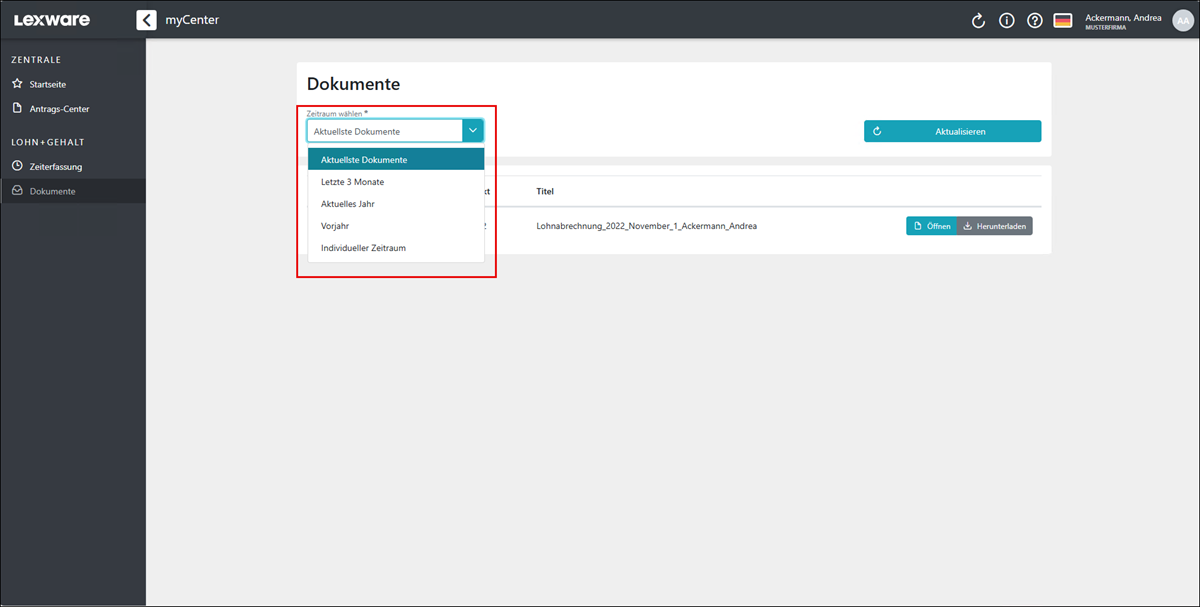 Über das Auswahl-Menü können sich die Mitarbeiter auch ältere Dokumente abrufen. Es stehen mehrere Auswahlfilter zur Verfügung.