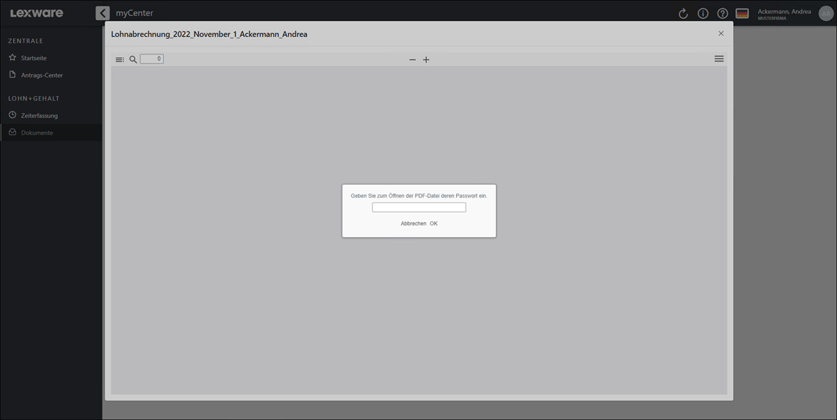 Mit Klick auf 'Öffnen' wird das Dokument geladen. Jetzt muss der Mitarbeiter noch sein individuelles Kennwort für den Dokumentenschutz eingeben.