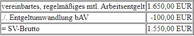 Hinweise: Wenn der Mitarbeiter Entgelt in eine sozialversicherungsfreie, betriebliche Altersvorsorge (bAV) umwandelt oder durch Entgeltumwandlung ein Jobrad finanziert, wird das sv-pflichtige Brutto gemindert.