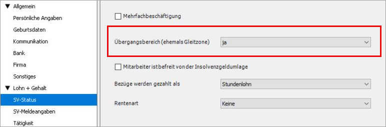 - Wählen Sie beim Eintrag 'Übergangsbereich 'ja' oder 'nein' aus, je nachdem ob das regelmäßige Entgelt im Übergangsbereich liegt.