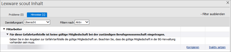 - Prüfen Sie die Hinweise im Lexware scout. Blenden Sie dazu ggf. inaktive Hinweise ein.