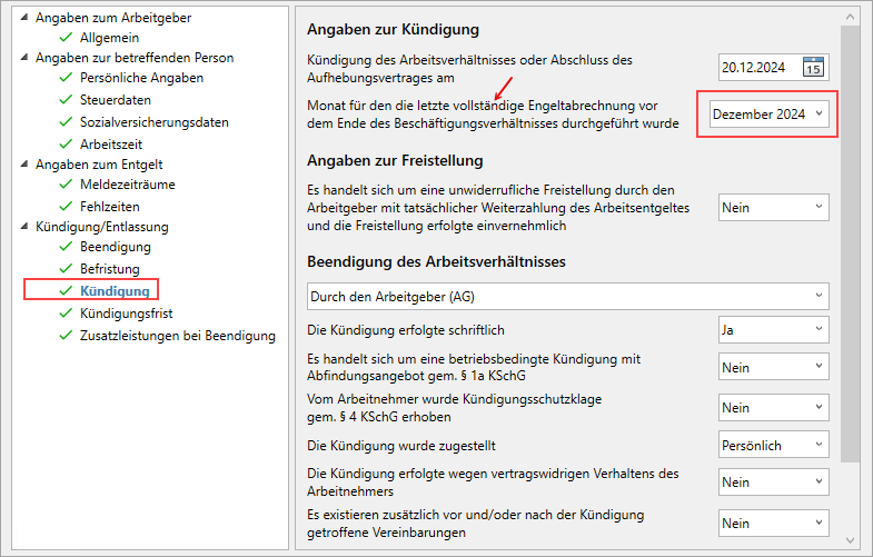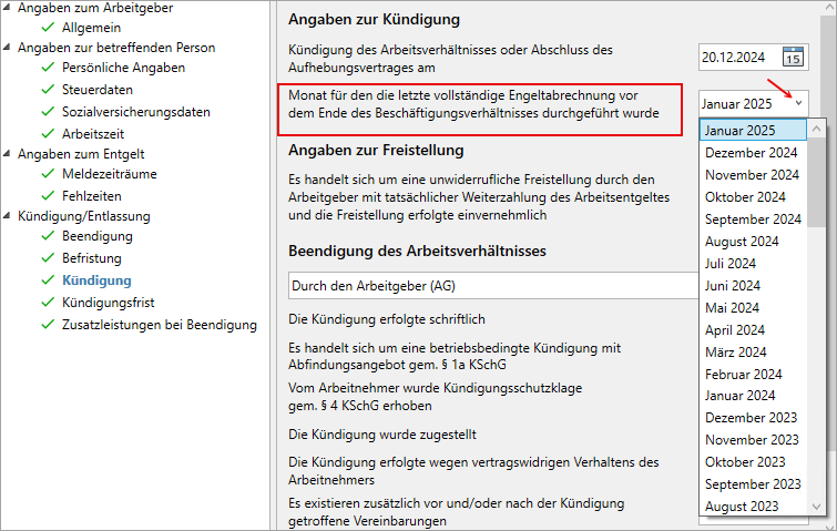 In der Arbeitsbescheinigung unter der Seite 'Kündigung' wurde im Feld 'Monat, für den die letzte vollständige Entgeltabrechnung vor dem Ende des Beschäftigungsverhältnisses durchgeführt wurde', fälschlicherweise der 'Dezember 2024' ausgewählt.